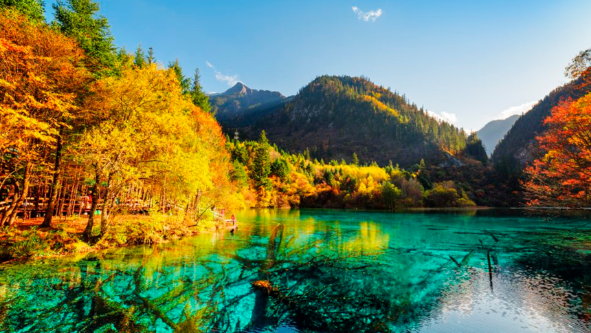 九寨沟国家公园简称九寨沟是中国著名的风景区,它以翠海、瀑布、彩林、雪山、藏晴、荷兰冰等六绝而驰名中外,它于1992年被联合国教科文组织列为世界遗产。 你可能还没机会去那里参观一下,或者你已经去过了,但你可能不知道2017年的一场地震给它造成的破坏以及修复之后的变化。 没关系,现在你有下面这个机会跟着我的摄影镜头重返这个被称为人间仙境的美丽风景之地,去那里欣赏一下每一个著名景点。 我们从太空中瞭望中华大地,可以看到位于中国中部有天府之国之称的四川平原。 现在我们下降高度到几百公里高空,可以看到四川省西北部的雪山群,在成都的西北面这片雪山就是明山山脉。 我们继续下降高度到几公里的高空,可以看到这片形状类似一个蝎子的雪山群,它就是嘎尔纳山峰,也是九寨沟黄龙国家级风景保护区。 它属于阿巴藏族羌族自治州,位于松潘县和九寨沟县之间,著名的九寨沟国家公园就坐落在这片雪山群的山沟里。 它的形状类似一个倒过来的鸭字形或Y字母,占地近700平方公里,可参观的风景区面积为50平方公里。 我们现在把地图的南北方向颠倒过来,便与我们看这一片Y字母形状的山沟,这就是九寨沟国家公园的风景区。 九寨沟的名字来自于一枚沟中由九个藏族村寨而得名,它的Y字母地形由三个主要的沟谷所构成,它们从北到南分别是树正沟,玉泽沟和泽查瓦沟,整个公园南北总长度约50公里。 现在我们前往九寨沟的沟口,处于沟谷的最北端,也就是Y字形最下端的国家公园的大门,从那里进入风景区,从北往南去顺序参观各个著名景点。 这是新建的公园大门和停车场,旅游者们都需要乘坐公园指定的特别环保公交车沿着这条公园里主要公路前往各个景点。 我们到达了第一条沟树正沟景点的开始端,可以看到湾区的河流和层层叠加的湖泊。 我们从空中看,树正沟著名景点包括盆景滩、芦苇海、双龙海、火花海、卧龙海、树正群海、树正瀑布、老虎海、犀牛海。 现在,我们从空中下降高度开始参观树正沟。 树正沟全长14公里,共有40多个大小湖泊占九寨沟景区全部湖泊的40%。 现在我们来到了树正沟第一个景点盆景滩。 盆景滩,顾名思义,河滩边的树丛从湖水中冒出,像是一个个大自然组成的盆景。 盆景滩坡度舒缓,湖滩上有杜鹃、羊柳、松白等各种灌木丛矗立于水中,形成了千姿百态温然天成的大自然盆景的美丽景观。 盆景滩 从盆景滩往前走就是下一个景点芦苇海。 芦苇海海拔约2200米,长约1.5公里,是一个长满芦苇的半沼泽湖泊。 芦苇海 芦苇海的奇特是,在芦苇中间有一条湖水带,湖水底部的沉积面闪耀着灿烂的翡翠色。 它像一条飘逸的玉带,蜿蜒穿行于芦苇丛中,与周围的绿树一起,组成了一片仙境一样的抒情秀丽景色。 芦苇海 芦苇海后的景点是双龙海。 过去在这里,曾经是丛林深处的两条瀑布倾斜在一大片绿色的湖泊上,因此得名双龙海。 这是我在2009年拍到的镜头。 在红叶的衬托下,这里的秋色特别恬静美丽。 2017年8月8日的大地震,打破了这里宁静的童话世界。 双龙海也是遭遇重创的景点之一,湖泊的上游塌方造成一片狼藉的泥土堆,原来的两条龙瀑布也永远消失了。 但是今天重建后的双龙海,一个新的景点诞生了。 水流从树林漫过后,在塌方后的断崖处分流倾斜而下,形成一个长85米、规模更大的新的巨大的散发型瀑布,并成为景区内水量最大的瀑布。 诚可谓仙境重归。 下一个景点是火花海。 火花海因阳光斜射湖面时的波光粼粼,颇似火花闪烁而得名。 在层层翠绿中,火花海像一个晶莹无比的翡翠盘。 秋季时,湛蓝色湖水与金色的树叶相映成灰,倒下的树木在湖水中清澈可见,使火花海晶莹剔透与佳规立。 现在所看到的这个景色是2009和2010年的拍摄。 2017年的地震使火花海出水口堤坝崩塌,造成绝口,使湖泊景观消失,令人惋惜。 震后的修复重建,恢复了火花海漂亮的景观。 倒下的树木在蓝色湖水中独增秀丽特色。 接下来我们来到了下一个景点沃隆海。 小巧玲珑的沃隆海像一块晶莹剔透的蓝宝石,浓重的蓝色醉人心田。 春夏季节,它一片翠绿和湛蓝。 秋天时刻,它边上重重叠叠的瀑布和金色秋叶则组成了一幅美不胜收的油画。 下一个景点是树正群海。 它的地貌特色使泥石流堆积物经过钙滑沉积造成了一大片阶梯式的斜坡。 阶梯上的湖滴之间是一个个翡翠色的梯湖。 它们就像一个个翡翠镶嵌在一条项链上挂在了这个深山幽谷中。 湖泊之间,湖水翻越湖滴,从树丛中溢出而挤起白色的水花,形成层层叠叠的大小飞兔,造就了一幅幅水莲的童话般景色。 树正群海的各种奔腾而下的溪流和瀑布水景多彩多姿,简直是集天下水景之大成,不愧为是久在归来不看水的精彩说明。 走到树正群海的末端便是树正瀑布的景点。 树正瀑布虽然只有11米的高度,是九寨沟四大瀑布中最小的一个,但在它面前看高坡上倾泻而下的巨大水莲,它像是从天而降仍旧显得高大。 瀑布飞落西渐,神采飘逸,雄厚的瀑中影响听起来惊心动魄,犹如奔腾的千军万马,震撼人心。 树正群海之后的景点是老虎海。老虎海是一个长310米宽194米的湖泊,坐落在两边的山崖之中,因为岸边的彩林倒映在清澈的湖水中,犹如斑斓的虎丸而得名。 金色的秋季,湖岸山上层林静然,叉子烟红的林木倒映在清澈的湖水中,一片灿烂景色。 湖的另一头,有一片在水中