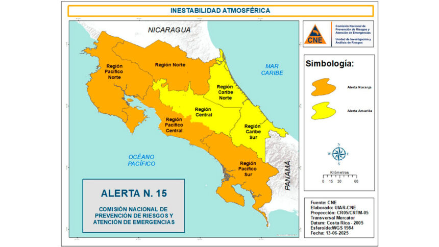 [San José, Costa Rica] – 13 de junio de 2025 – 11:00 horas – La Comisión Nacional de Prevención de Riesgos y Atención de Emergencias (CNE) ha emitido alerta naranja y amarilla debido a las condiciones atmosféricas inestables que afectan al país, producto de varios factores, incluyendo la Onda Tropical #5 y un sistema de baja presión asociado a la Zona de Convergencia Intertropical (ZCIT).