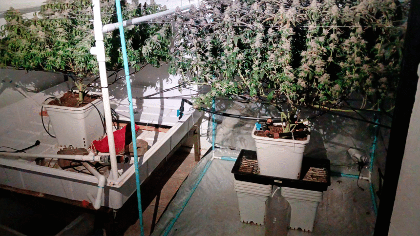 Durante el allanamiento a la vivienda principal, los investigadores localizaron un pequeño laboratorio hidropónico destinado al cultivo de plantas de marihuana.