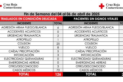 Cruz Roja Costarricense reporta 20 fallecidos y 126 traslados críticos durante fin de semana